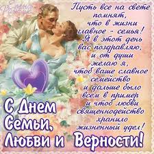 Никакая сногсшибательная карьера и золотые горы не заменят поддержку родного плеча, детскую улыбку, теплые объятия. С днем семьи, любви и верности! С днем семьи, любви и верности поздравления вам шлём. Ароматом дивным нежности пусть наполнится ваш дом! Желаю счастья и радость вашему.